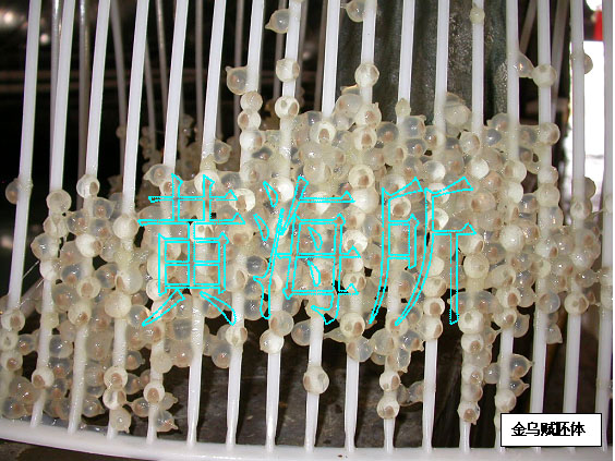 项目实施期间,课题组共采集驯化培育体重300g~1200g的金乌贼亲体233尾;验收组现场测定正处于不同发育阶段的受精卵有2.2万粒;已经孵化培育的幼体数量有4.7万尾,幼体具有金乌贼生物学特征,生长良好,摄食积极,对外界刺激反应灵敏。