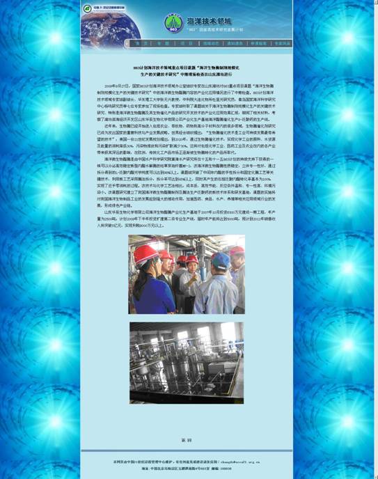 黄海所承担的国家“十一五”863计划海洋技术领域“新型海洋生物制品研究开发”重点项目课题之一“海洋生物酶制剂规?;墓丶际跹芯俊弊?009年9月27日立项以来,已取得多项阶段性成果,其中:“海洋微生物酯酶及其生物催化产品研究开发技术的产业化应用”得到了专家组的充分肯定,科技部国家863海洋技术领域对该研究成果进行了宣传。(详见http://www.863.org.cn/)