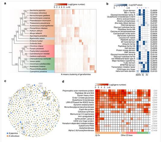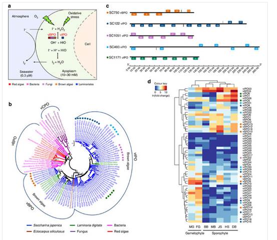 研究团队获得了海带主要栽培品系的高质量基因组组装结果,组装大小为537 Mb,覆盖了全基因组序列的98.5%,共有18,733个蛋白编码基因。比较基因组学分析发现海带基因组扩增主要源于基因家族的扩增,海带与丝状褐藻水云的祖先获得1,240个基因家族,其中与细胞壁合成、卤素代谢、发育与防御有关的基因家族出现明显扩增。进一步的功能分析发现,褐藻胶合成关键酶甘露糖醛酸C-5差向异构酶及卤素代谢关键酶卤素过氧化物酶通过基因大量复制实现其功能分化。