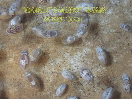 项目组经过3年的研究,通过工厂化设施进行金乌贼人工养殖越冬,培育成熟亲体59只,金乌贼人工越冬成活率达到86.8%。在人工调控下金乌贼产卵繁殖较自然海区提前2~3个月,现场观察有处于不同发育阶段的受精卵3000余粒,受精卵孵化正常,胚胎清晰可见,金乌贼亲体仍处于产卵繁殖中。