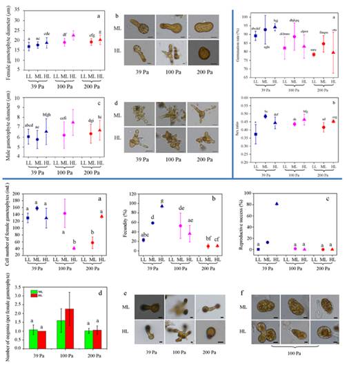 近期,课题组采用短期酸化应急实验和长期酸化适应性研究相结合的方式,开展了海洋酸化对海带发育生活史的影响研究。研究结果显示,酸化条件下海带游孢子萌发率、雌配子体的排卵数及授精率显著降低,雌雄配子体的性别比例改变,且雌雄配子体的个体大小均显著增加。双因子耦合试验显示,海带早期发育的酸化效应受到光照强度的调节。长期酸化条件培养的海带幼孢子大小及其PSII光合性能均显著增加,体组织C/N比例发生明显变化。该研究揭示了海洋酸化对大型褐藻不同世代的双重效应,为探索全球气候变化条件下大型褐藻的分布及群落结构变化趋势提供了重要理论依据。