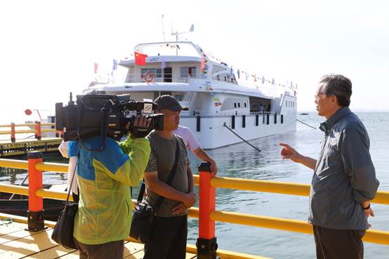唐启升院士在“东楮岛号”海上体验乐园接收中央电视台采访