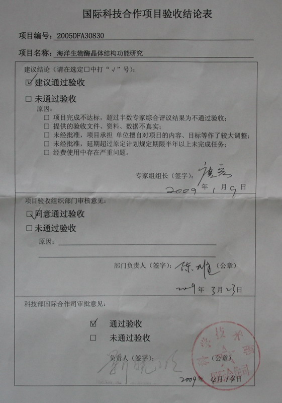 近日,黄海所主持的科技部国际合作计划重点项目“海洋生物酶晶体及结构与功能研究”顺利通过了由科技部国际合作司组织的专家验收。