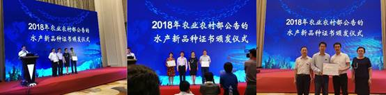 5月31日,2018全球水产养殖论坛水产种业发展分论坛在福州召开?;嵘暇傩辛?018年农业农村部公告的水产新品种证书颁发仪式?;坪K芯克刮舶紫骸盎朴?号”(GS-01-005-2017),中国对虾“黄海5号”(GS-01-008-2017)和刺参“参优1号”(GS-01-016-2017)获批水产新品种。农业农村部渔业渔政管理局养殖处处长陈家勇和全国水产技术推广总站副站长胡红浪分别为新品种课题组代表李吉涛副研究员、孟宪红研究员、王印庚研究员颁发证书。