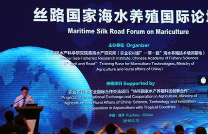 5月31日,“丝路国家海水养殖国际论坛”在福州召开。论坛由黄海水产研究所与中国水产流通与加工协会、全国水产技术推广总站、中国水产学会、中国-东盟海水养殖技术联合研发与推广中心和国家虾蟹产业技术体系等联合主办。论坛以“合作发展共享”为主题,聚焦“一带一路”热带国家水产养殖,共享科技成果、共商技术合作?!?018全球水产养殖论坛”同期举办,来自国内政府主管部门、科技教育机构、行业协会、水产龙头企业的代表,以及美国、挪威、英国、厄瓜多尔、日本、泰国、新加坡、印度尼西亚、印度、马来西亚、越南、柬埔寨、菲律宾等国家和地区的来宾近500人参加了论坛。