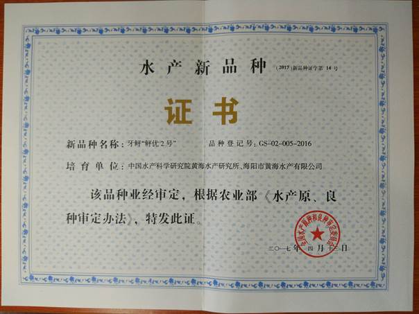 “鲆优2号”牙鲆新品种是黄海水产研究所联合海阳市黄海水产有限公司历经10余年培育出的抗病高产新品种,也是我国采用全基因组选择技术结合家系选育、雌核发育和种内杂交培育出的我国第一个鱼类抗病高产新品种。该新品种具有生长快、养殖成活率高的优点。经养殖对比,比未经选育的普通牙鲆生长速度提高20%左右,养殖成活率提高20%左右。该新品种于2017年获得国家水产新品种证书。