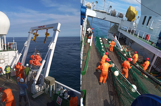 此次海试主要开展了渔业资源原位声学观测潜标的布放与回收、自主式科学探鱼仪的水下运行,浮游生物多联网的收放与采样效果,以及渔业资源底层拖网的收放与取样效果等内容的测试。海试的目的是对以上设备的海上操作进行演练,并确保采集数据的可靠性与样本的有效性,达到了预期效果。