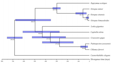 比较基因组学分析发现预测的31676个基因中有24698个可划入17020个基因家族。其中741个基因家族为10个物种共有,包含10653个同源基因。利用10个物种的238个单拷贝同源基因构建系统进化树,结果表明长蛸的分化时间早于中国真蛸和加州双斑蛸,而中国真蛸与加州双斑蛸关系更近,其分化时间约为13.88 Mya(图1)。