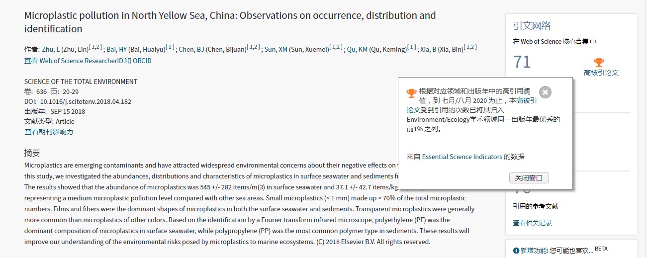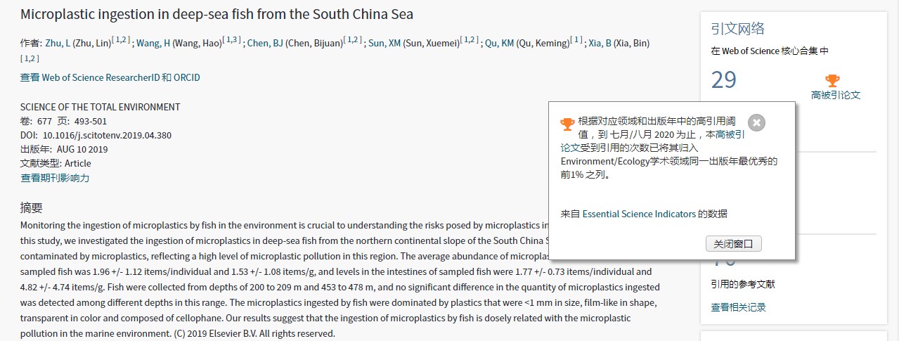 根据11月24日基本科学指标数据库(Essential Science Indicators, ESI)分析数据显示,中国水产科学研究院黄海水产研究所陈碧鹃研究员领衔的渔业环境污染生态学团队发表的海洋微塑料污染特征研究论文《Microplastic pollution in North Yellow Sea, China: Observations on occurrence, distribution and identification》(Zhuet al., 2018, Science of the Total Environment)《Microplastic ingestion in deep-sea fish from the South China Sea》(Zhuet al., 2019, Science of the Total Environment)入选ESI高被引论文(ESI-Highly Cited Papers)。本次ESI数据统计区间覆盖了从2010年至2020年8月期间发表的论文。