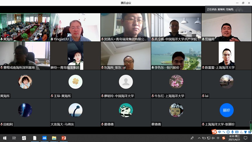 4月21日,中国水产科学研究院黄海水产研究所牵头承担的国家重点研发计划“蓝色粮仓科技创新”重点专项“海水池塘和盐碱水域生态工程化养殖技术与模式(2019YFD0900400)”项目2020年度总结暨2021年工作推进会在山东青岛召开。项目跟踪专家中国科学院海洋研究所杨红生研究员、中国水产科学研究院渔业机械仪器研究所徐皓研究员,咨询专家中国水产科学研究院刘英杰研究员、广东恒兴饲料实业股份有限公司李色东教授级高工参会指导。来自中国水产科学研究院黄海水产研究所、中国科学院海洋研究所、中国海洋大学、中国水产科学研究院东海水产研究所、中国水产科学研究院黑龙江水产研究所、宁波大学、中国水产科学研究院南海水产研究所深圳试验基地、上海海洋大学、大连海洋大学、青岛瑞滋集团有限公司等10家项目参与单位共50余人参加了会议。