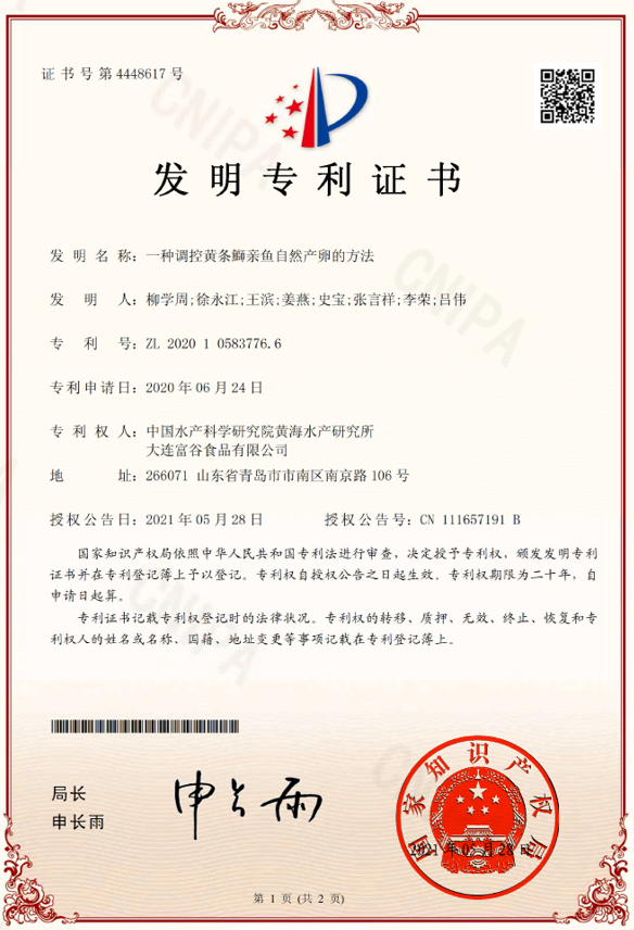 近日,由中国水产科学研究院黄海水产研究所柳学周等发明的“一种调控黄条鰤亲鱼自然产卵的方法”获国家发明专利授权,专利号:ZL202010583776.6。