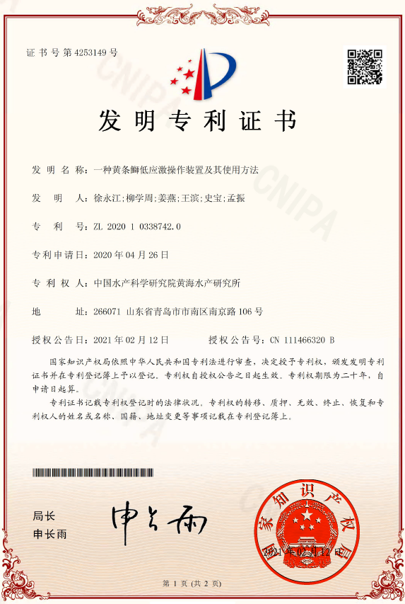 近日,由中国水产科学研究院黄海水产研究所徐永江等发明的“一种黄条鰤低应激操作装置及其使用方法”获国家发明专利授权,专利号:ZL202010338742.0。