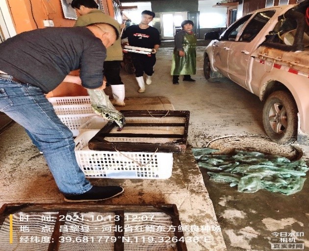 调查组历时一个月,先后从威海银泽生物科技有限公司、大连富谷集团、唐山牧海水产养殖有限公司、唐山海都水产食品有限公司、河北海洋与水产科学研究院海水繁育基地、大连天正水产有限公司等企业,共采集活体种质资源500尾、标本资源13份、基因资源1200份。
