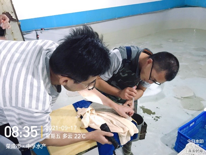 调查期间,在小组负责人马爱军研究员的带领下,团队成员整理每个调查点基本信息,认真填写《水产养殖种质资源基础信息表》;按照《鱼类样品采集技术规范》要求,完成了调查点大菱鲆个体生物学特性测量及数据、图像采集工作,完成了品质、遗传多样性指标、生理生化指标检测样本的收集;按照《鱼类种质资源遗传材料制作规范》要求,完成了调查点标本、基因、细胞种质资源的采集和制作。通过了解每个调查点大菱鲆养殖条件、投喂情况及存量,多方协调,制定周密的活体运输与保存方案,完成了活体资源保存工作。调查组选择烟台开发区天源水产有限公司与威海中孚水产养殖有限责任公司两个国家级良种场进行活体保存,并进行登记、存档,专人负责确保隔离养殖。