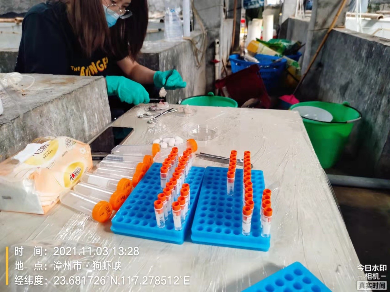 9月初,调查小组先后奔赴青岛西海岸新区、日照、福建等地,按计划开展资源调查工作。团队成员严格遵循《鱼类样品采集技术规范》要求,详实记录每个调查场所的水质参数、个体数量性状、组织、图像等数据及样品的收集工作。根据《鱼类种质资源遗传材料制作规范》要求,开展了各个调查点基因、细胞等种质资源及标本的采集和制作,填写完成《水产养殖种质资源基础信息表》,保证了收集数据的详实可靠。根据各个调查点的实际养殖情况,经过协商,选择性开展了美国红鱼种质的活体保存工作,其中福建逸有水产科技有限公司、福建高成水产养殖场及青岛清峰渔业有限公司保存5-6龄亲鱼共1000尾,后备亲鱼(4龄)2500尾,其余四家调研点各保存后备亲鱼300尾,并作了详细登记、存档。