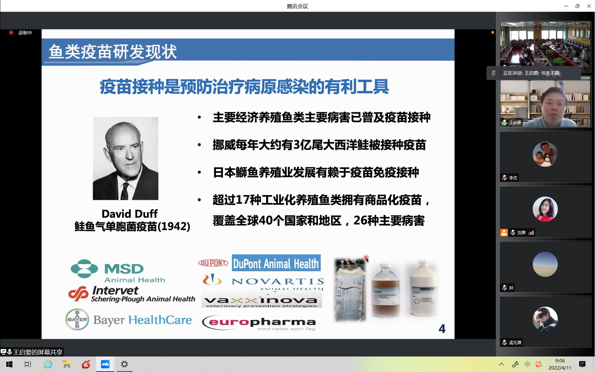 4月11日,华东理工大学生物工程学院王启要教授应邀与中国水产科学研究院黄海水产研究所科研人员进行线上交流,相关科研人员和研究生等60余人参加了交流会,会议由黄海水产研究所养殖生物疾病控制与分子病理学研究室主任张庆利研究员主持。