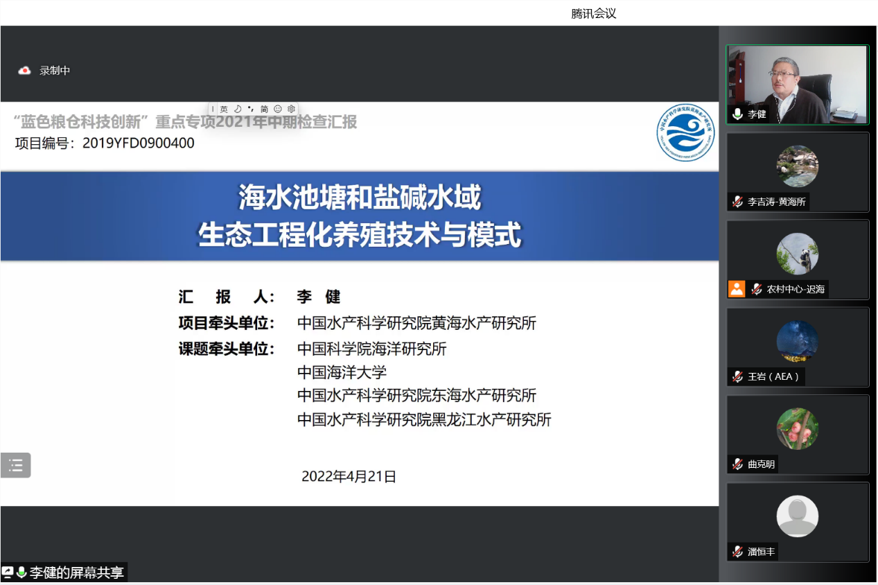 4月21日,中国水产科学研究院黄海水产研究所牵头承担的国家重点研发计划“蓝色粮仓科技创新”重点专项“海水池塘和盐碱水域生态工程化养殖技术与模式”项目中期检查会以视频会议形式召开?;嵋橛煽蒲Ъ际醪恐泄┐寮际蹩⒅行闹靼?,“蓝色粮仓科技创新”专项项目专员王振忠主持。农村中心科技攻关处处长卢兵友,项目中期检查专家组专家桂建芳院士、杨红生研究员、方辉研究员、陈焕根研究员、吕剑研究员,黄海水产研究所所长金显仕、科研处处长刘志鸿,以及项目负责人、课题负责人、项目成员等参加了本次会议。
