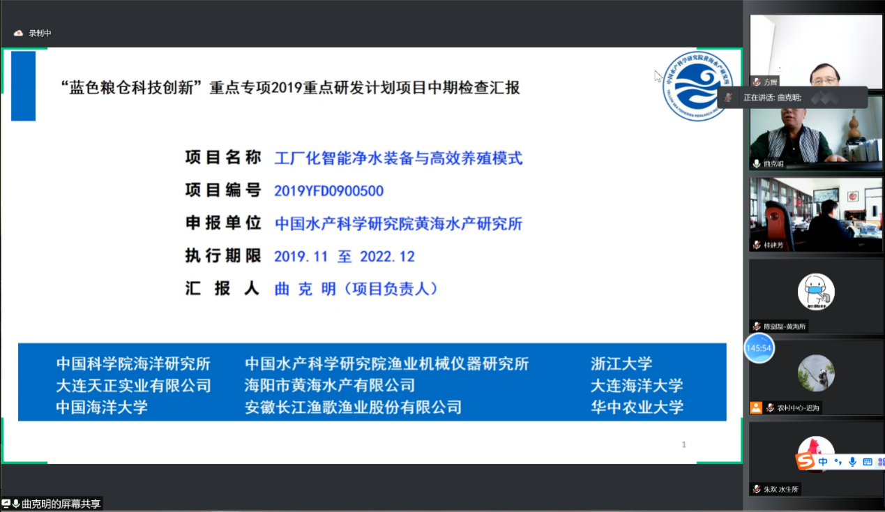 4月21日,由中国水产科学研究院黄海水产研究所牵头承担的国家重点研发计划“蓝色粮仓科技创新”重点专项“工厂化智能净水装备与高效养殖模式”(2019YFD0900500)项目中期检查会以网络视频会议形式召开?;嵋橛煽蒲Ъ际醪恐泄┐寮际蹩⒅行闹靼?。农村中心科技攻关处处长卢兵友,“蓝色粮仓科技创新”专项专员王振忠,项目中期检查专家组专家桂建芳院士、杨红生研究员、方辉研究员、陈焕根研究员、吕剑研究员,黄海水产研究所所长金显仕、科研处处长刘志鸿,以及项目负责人、课题负责人、项目组成员等120余人参加了本次会议。