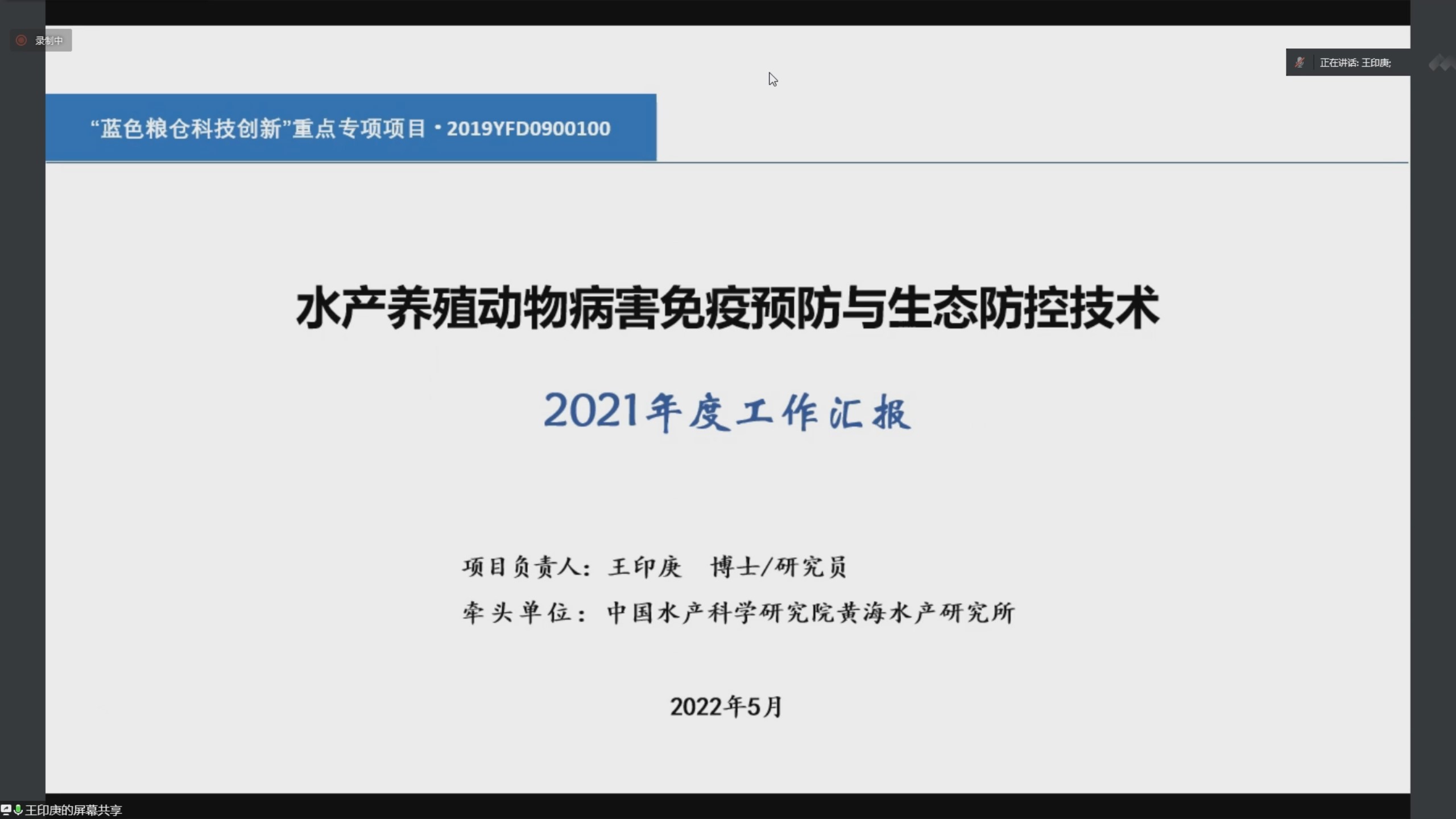 5月30日,由中国水产科学研究院黄海水产研究所牵头承担的国家重点研发计划项目“水产养殖动物病害免疫预防与生态防控技术”2021年度工作总结暨2022年度工作推进会采用视频会议形式召开?;嵋橛上钅扛涸鹑送跤「芯吭敝鞒郑裳宜瘟稚淌?、王春林教授应邀出席会议并进行指导?;坪K芯克蒲写ΥΤち踔竞瑁约案骺翁飧涸鹑?、项目骨干等70余人参加了本次会议。