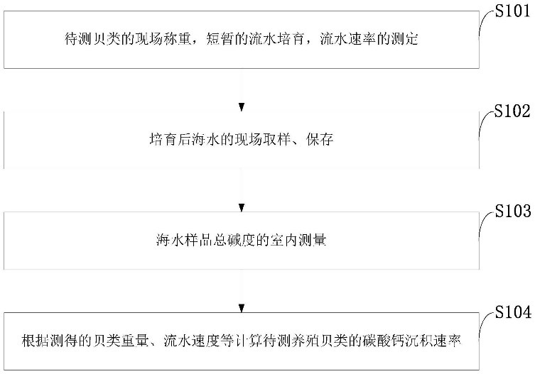 本发明属于海水贝类养殖技术领域,公开了一种测定养殖贝类碳酸钙沉积速率的方法及应用,包括待测贝类的现场称重,短暂的流水暂养,流水速率的测定以及培育后海水的现场取样、保存,海水样品总碱度的室内测量以及根据测得的贝类重量、流水速度等计算待测养殖贝类的碳酸钙沉积速率。