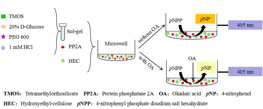 本发明涉及一种腹泻性贝类毒素快速检测试剂盒及其检测方法,属于水产品安全检测领域。试剂盒包括:(1)包埋有蛋白磷酸酶2A(PP2A)酶凝胶的96孔微孔板;(2)大田软海绵酸浓度梯度系列标准溶液;(3)缓冲溶液A;(4)缓冲溶液B;(5)底物显色溶液;(6)质控样品溶液。本发明采用改进的溶胶?凝胶技术将PP2A酶固定在微孔板底部,利用腹泻性贝类毒素在碱性条件下抑制PP2A酶催化无色底物对硝基苯磷酸二钠去磷酸化产生黄色产物对硝基苯酚(pNP)的反应,根据pNP在405 nm处吸光度与毒素浓度的剂量?反应关系对毒素进行定量检测。本发明样品前处理和检测步骤简单,操作技术要求不高,耗时较短、费用低廉、准确率高,适用于大批量贝类样品中腹泻性贝类毒素的快速筛查。