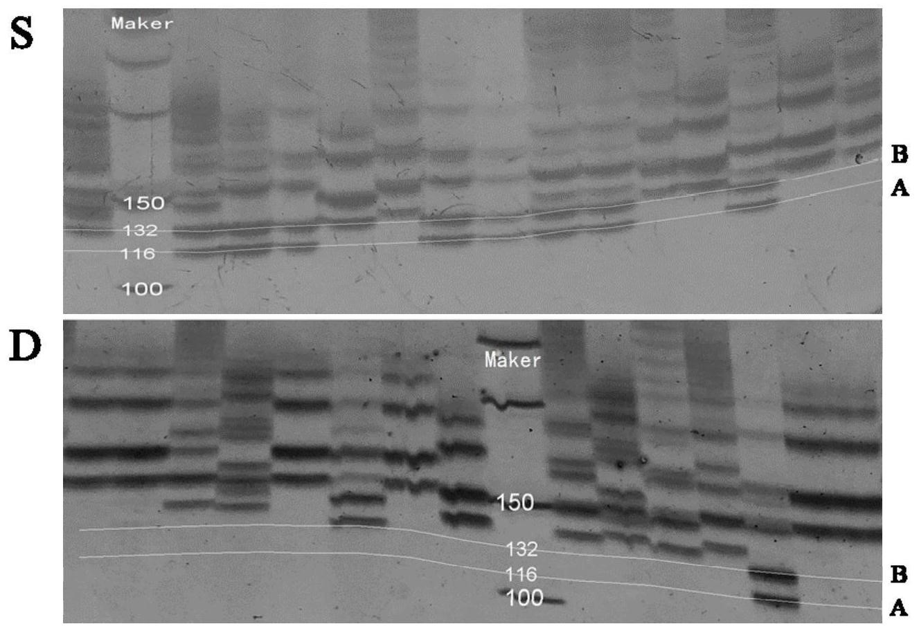 本发明涉及一个与红鳍东方鲀耐低温相关的微卫星标记及其应用,属于鱼类DNA标记技术与应用领域,具体涉及红鳍东方鲀耐低温分子标记的筛选,以及利用标记进行分子标记辅助育种。利用BSA?SSR技术筛选到1个与红鳍东方鲀耐低温相关的微卫星标记(fms108),其引物序列为正向:AACATGCGACAGAACTGACTG,反向:TCCACAGCCAATGTTAATGG。根据此标记可以进行育种亲本的选择,从而提高后代的耐低温性能。