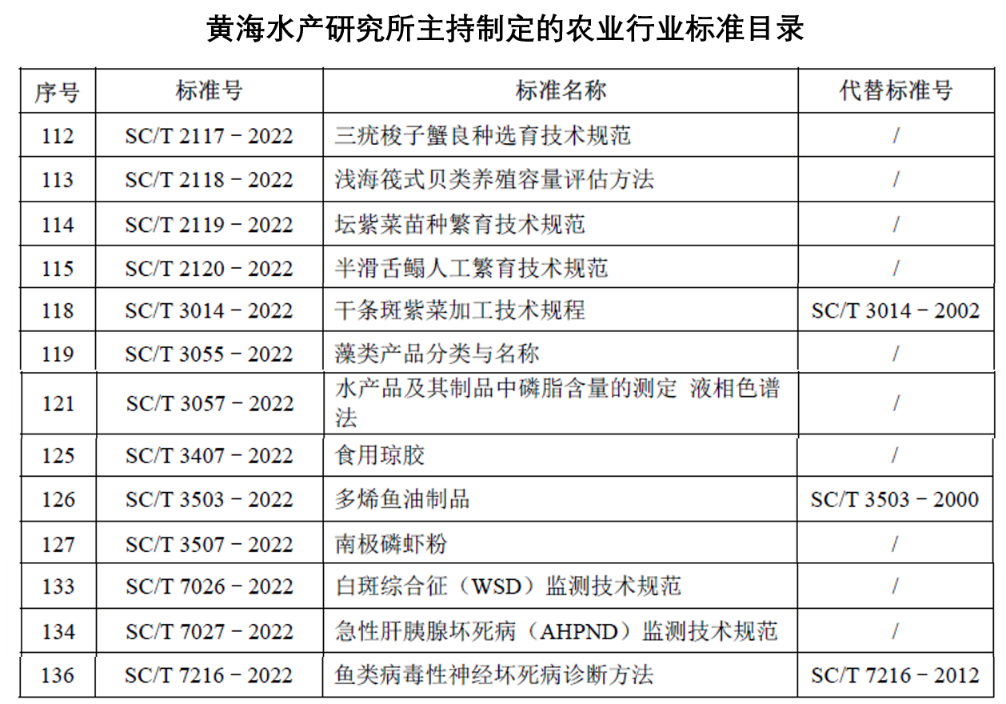 11月11日,农业农村部印发《中华人民共和国农业农村部公告第618号》,公布了160项经专家审定通过的农业行业标准,自2023年3月1日起实施。由中国水产科学研究院黄海水产研究所科研人员牵头主持完成的13项农业行业标准正式获批发布,其中包括良种选育规范4项、水产品加工领域6项及病害监测技术规范3项。以上标准的发布和实施,有利于规范和引导水产养殖、病害防控、水产加工行业的发展,对提高渔业管理水平、促进产业可持续发展和规范市场行为等方面发挥重要作用。
