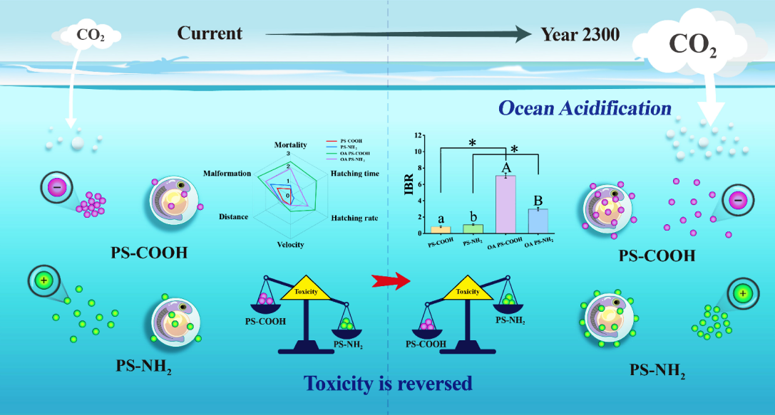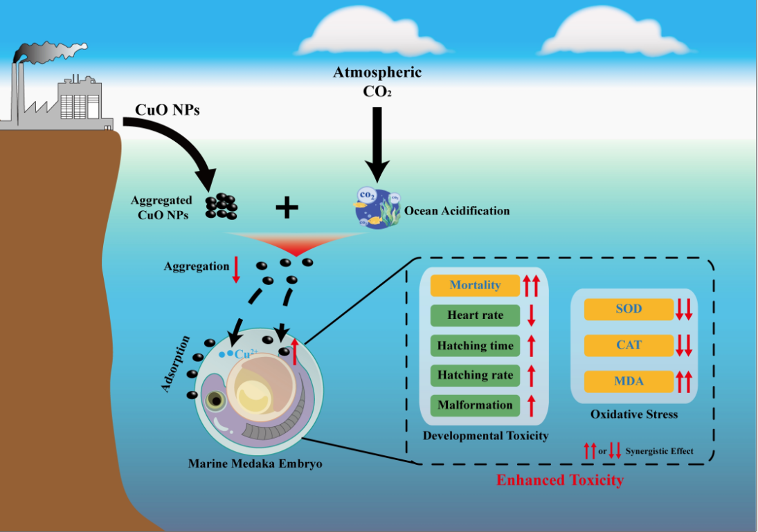 金属氧化物纳米颗粒和纳塑料是典型的新污染物。研究团队在海洋酸化耦合纳米CuO颗粒/聚苯乙烯纳塑料、UV-B辐射耦合纳米TiO2颗粒对海洋生物的毒性效应方面开展深入研究,取得一系列创新性成果。研究发现,随着UV-B辐射和纳米TiO2颗粒暴露浓度/剂量的增加,UV-B辐射减弱了纳米TiO2颗粒暴露下小球藻胞外聚合物的分泌,胞外聚合物对小球藻的?;ぷ饔眉跞酰贾赂嗟哪擅譚iO2颗粒能够进入藻细胞内并诱导氧化损伤,该研究成果入选Environmental Science:Nano期刊封面文章。研究表明,海洋酸化逆转了不同表面电荷聚苯乙烯纳塑料对海水青鳉胚胎的毒性效应,这主要是由于海洋酸化条件下不同表面电荷聚苯乙烯纳塑料的悬浮性能发生改变,从而导致海水青鳉胚胎和仔鱼体内不同表面电荷聚苯乙烯纳塑料的富集含量发生逆转(Chen et al., 2023,Science of the Total Environment)。研究揭示,海洋酸化增强了纳米CuO颗粒对海水青鳉胚胎的毒性效应,这主要是由于海洋酸化条件下纳米CuO颗粒的团聚性能减弱、水力直径变小,导致了更高的生物利用度,而不是海洋酸化条件下纳米CuO颗粒释放Cu离子增加引起的(Wang et al., 2023, Journal of Hazardous Materials)。以上研究为科学评估气候变化条件下金属氧化物纳米颗粒和纳塑料的海洋生态风险提供了重要支撑。