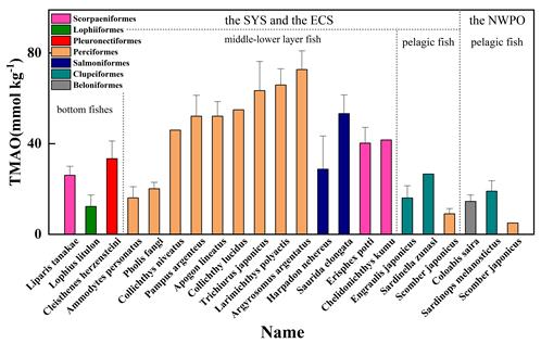 图1.中国近海和西北太平洋上层海域采集的不同种硬骨鱼中TMAO平均含量及其标准偏差