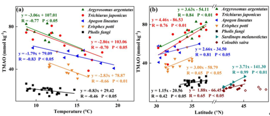 图2.中国近海及西北太平洋上层海域采集的硬骨鱼中TMAO含量与海水温度(a)和纬度(b)的相关关系