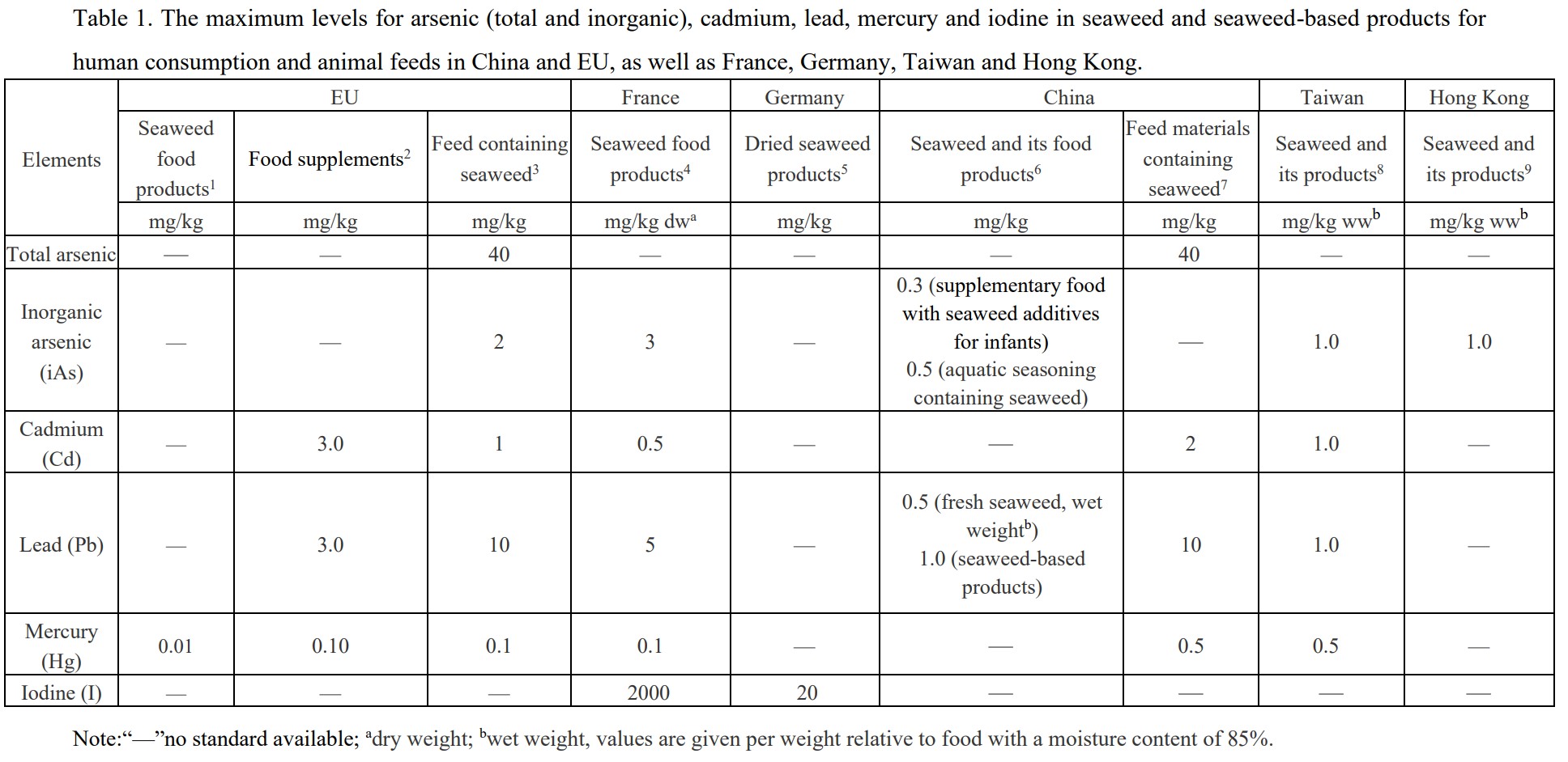 海藻中优先关注的潜在化学危害是无机砷、镉和碘元素,但是其风险大小具体取决于海藻种类、海藻消费量以及后续加工或烹饪方法。目前由于缺乏全球海藻消费量、消费方式、海藻中元素的生物利用度以及加工方式对海藻中元素的影响等大量科学数据支撑,涉及海藻生产、加工和利用的国际标准法规缺失,然而不同国家、地区之间对海藻的食用安全性认知和海藻产品中污染物、碘的限量规定存在很大差异,在一定程度上限制了海藻产品的国际贸易和开发利用。