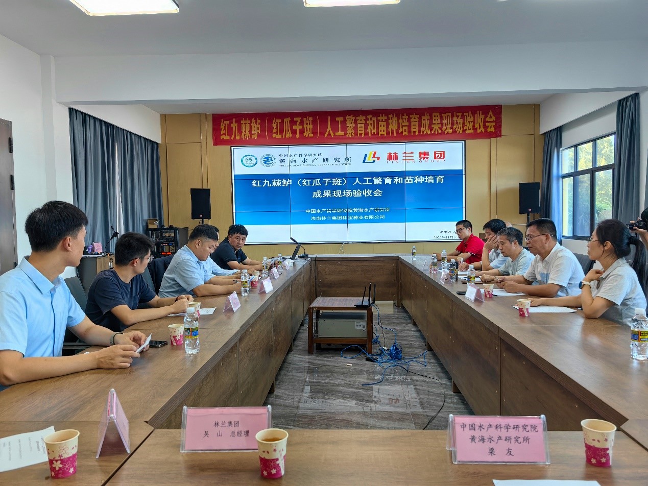 11月10日,中国水产科学研究院黄海水产研究所组织专家在海南省万宁市林兰集团林宝种业有限公司对黄海水产研究所陈松林院士主持、该公司参与完成的山东省重点研发计划项目(院士创新专项)“海水鱼类精准育种技术创建与种质创制”中有关红九棘鲈(红瓜子斑)人工繁育和苗种培育的阶段性成果进行了现场验收。验收专家组由中山大学生命科学学院刘晓春教授、海南大学海洋学院院长周永灿教授、海南热带海洋学院水产与生命学院副院长黄海教授组成。万宁市副市长郑忠发、万宁市海洋渔业协会会长叶慧强、海南省海洋产业集团代表等参加了验收会。