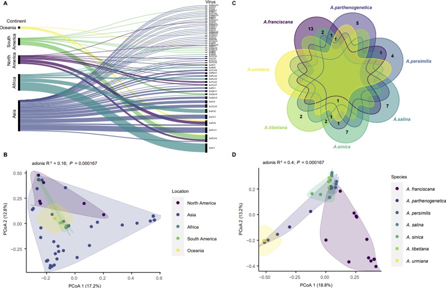 D:不同卤虫种间RNA病毒分布PCoA图