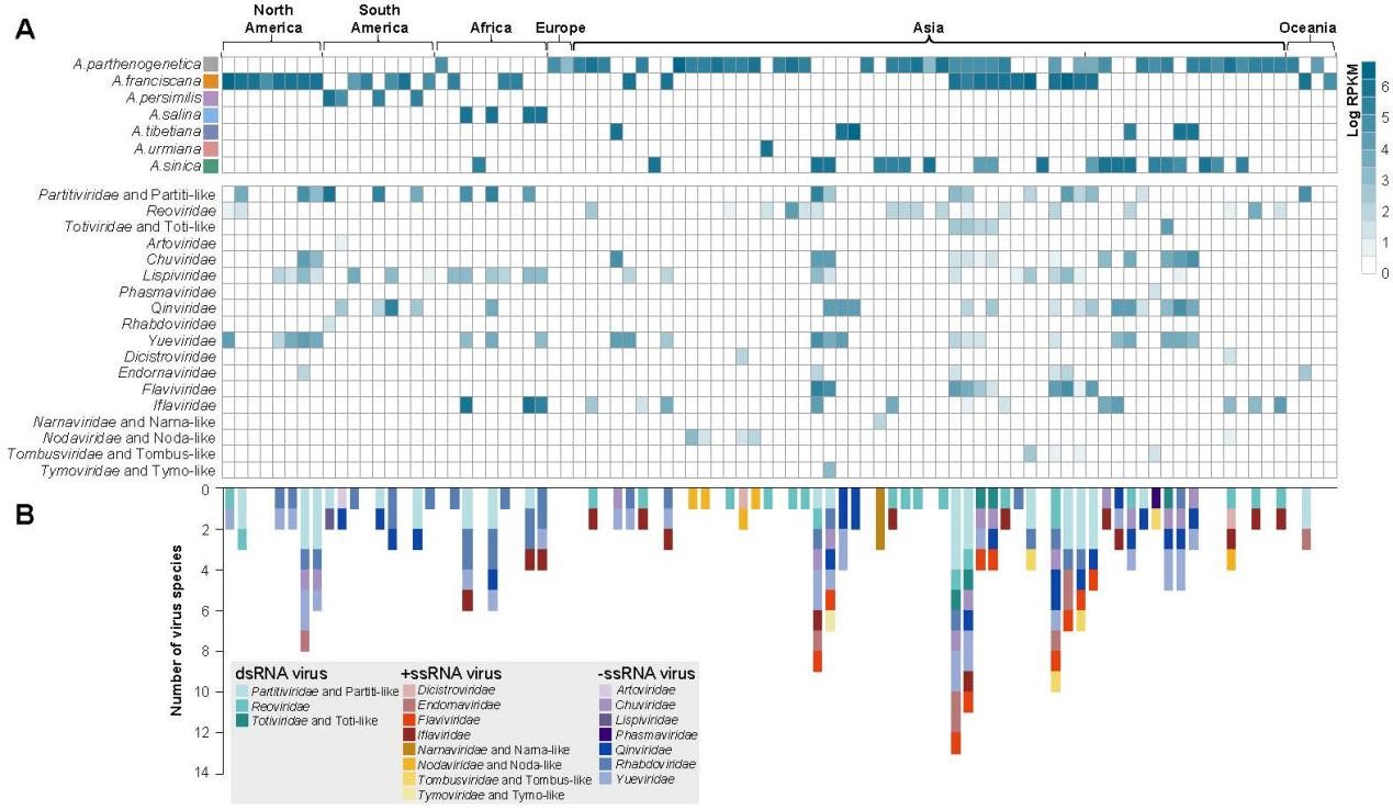 图2 卤虫中RNA病毒在不同地理位置和卤虫物种之间的分布
