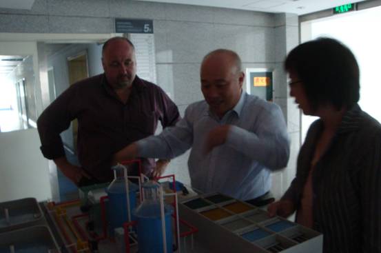 环境室主任马绍赛研究员向Mark D. Powell教授介绍循环水系统