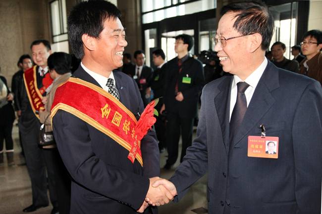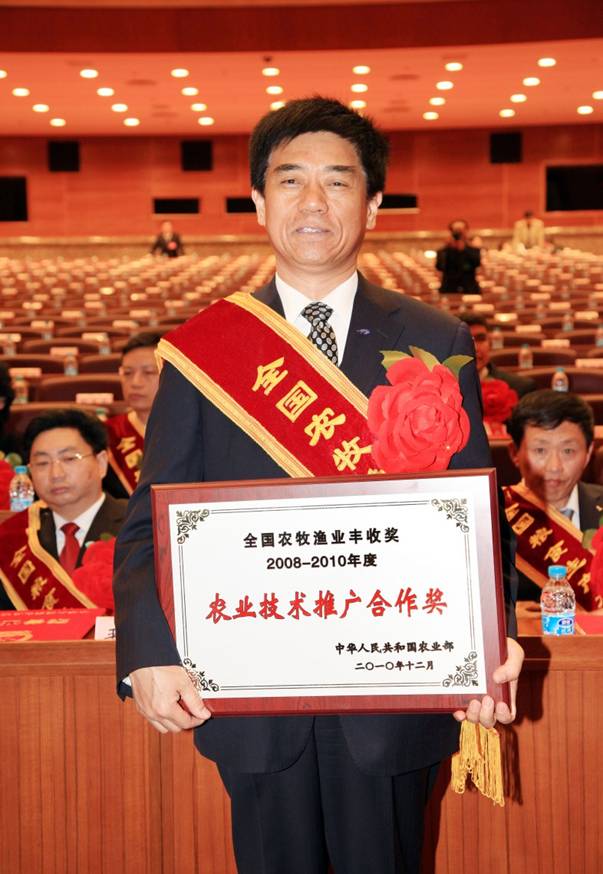 12月22日,在全国农业工作会议期间,农业部召开了全国粮食生产先进单位、个人及标兵、全国农牧渔业丰收奖表彰大会。国务院副总理回良玉以及农业部部长韩长赋等领导为获奖代表颁发了奖励证书。