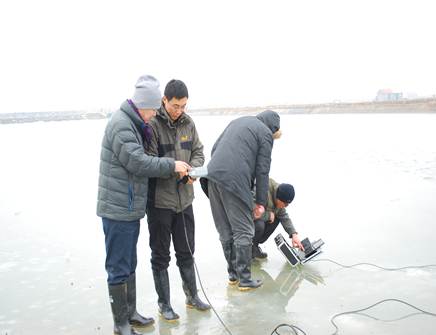 专家现场调查冰封期间海参池塘的水质变化和海参健康情况