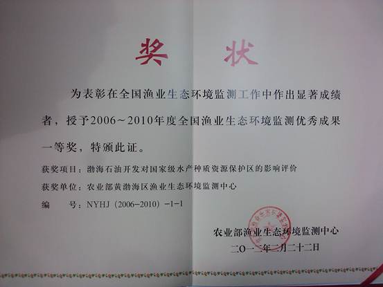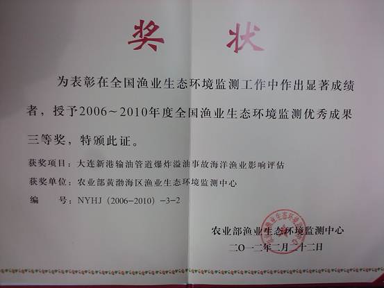 黄海水产研究所陈碧鹃研究员主持完成的“渤海石油开发对国家级水产种质资源?;で挠跋炱兰邸比倩袢嬉瞪肪臣嗖庥判愠晒坏冉?;赵俊副研究员主持完成的“大连新港输油管道爆炸溢油事故海洋渔业影响评估”荣获全国渔业生态环境监测优秀成果三等奖。