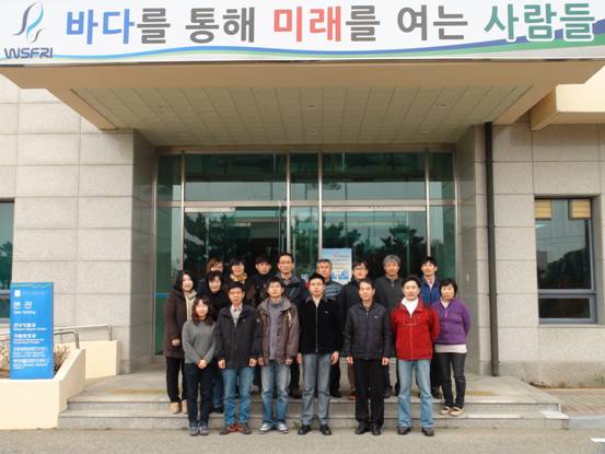 学术交流期间,罗坤助理研究员与韩国西海所水产养殖室科研人员进行了对虾育种及养殖方面的学术和技术交流,作了题为“Genetic Improvement Program On Chinese Fleshy Shrimp,Fenneropenaeus chinensis”的学术报告,介绍了我国在选育具有快速生长和抗WSSV等优良性状中国对虾良种方面取得的研究进展和成果,并在韩国西海所海水养殖研究中心进行了生物絮团养殖技术的交流和实践,参观了韩国清水水产养殖公司,对公司的对虾育苗、养殖概况进行了了解。