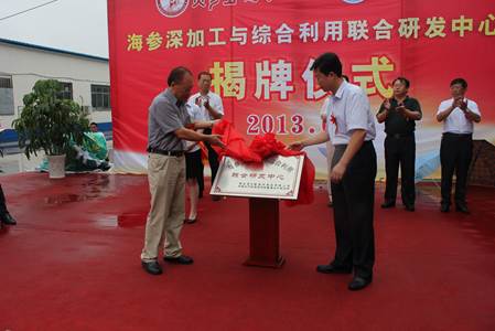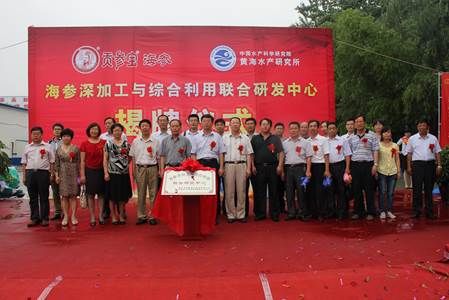 7月13日,中国水产科学研究院黄海水产研究所与青岛佳日隆海洋食品有限公司联合成立的“海参深加工与综合利用联合研发中心”揭牌仪式在平度市佳日隆公司隆重举行。青岛市政府蓝办和平度市科技局、发改委等部门的领导,黄海所食品工程室相关研究团队以及企业代表共50余人参加了揭牌仪式?;坪K澄榧且蟀钪摇⑵蕉仁腥嗣裾笔谐だ钣窈N蟹⒅行慕遗撇⒔不?。