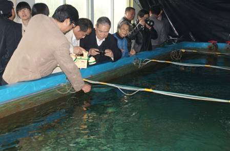 验收组听取了项目组的研究工作汇报,实地考察了亲鱼培育、受精卵孵化、鱼苗培养,以及系列繁育设施的运转情况,并对育苗车间内培育的多批苗种进行了随机抽样计数。经质询、答疑、讨论,一致认为:鲥鱼苗种繁育系列设施配套齐全、运行状况良好;保有的3000余尾Ⅲ龄亲鱼中,经人工驯化和营养强化后,均表现出生长良好的繁殖效果,采用人工生殖调控和利用自然环境调控的亲鱼,均可连续获得人工受精卵或在池中自然产卵受精;采用人工催产的亲鱼,平均受精率可达到83%;现有的6万余尾鲥鱼人工苗种,全长已达2-3cm,鱼苗健康、活力很强。