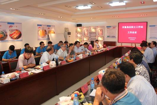 为全面评估山东省京鲁渔业院士工作站建站以来的科研项目进程和阶段成果,推动今后各项工作更好的开展, 8月25日,山东省京鲁渔业院士工作站在蓬莱京鲁渔业有限公司召开2014年度工作会议?;坪K芯克苑鹪菏俊⒌澄榧且蟀钪?、前党委书记葛相安、食品工程与营养研究室主任周德庆及相关科研人员前往参会。烟台市科技局副局长许博,蓬莱京鲁渔业有限公司董事长王轰、总经理牟伟丽,以及烟台市科技局、蓬莱市科技局等有关领导参加了会议。会议由牟伟丽总经理主持。