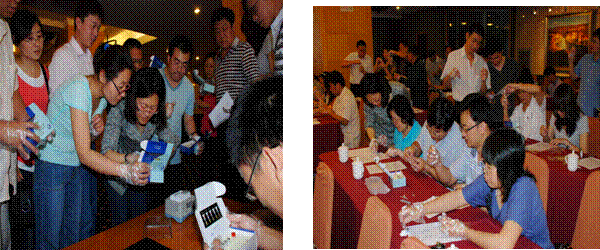 在全国水产技术推广总站主办的省级水生动物检疫理论知识培训班上对各省市水生动物检疫实验室的技术人员进行检测试剂盒的使用方法培训
