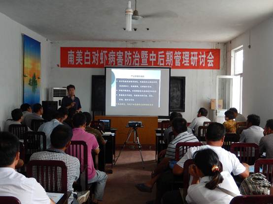 7月22-23日,由黄海水产研究所主持的“十二五”国家科技支撑计划“海洋水产病害综合防控技术的集成与示范”课题组在山东省滨州市博兴县乔庄镇举办池塘养殖南美白对虾病害防控技术培训班。来自当地从事南美白对虾养殖的人员约50人参加了培训,滨州市渔业技术推广站和博兴县水产局的相关负责人全程参与了培训活动。