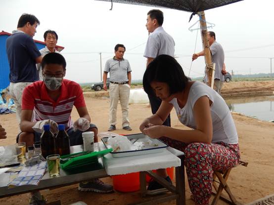 培训班上,黄海所王印庚研究员、中国科学院海洋研究所王雷研究员和中国海洋大学唐小千副教授分别就对虾的主要病害及防治技术、池塘养殖的水质调控和对虾白斑病毒的现场检测技术向参训人员进行了讲解,并与参训人员进行了互动,解答了养殖户提出的问题。培训班结束后,课题组专家还深入养殖一线,在对虾养殖池塘边就养殖过程中遇到的实际问题进行了现场指导。