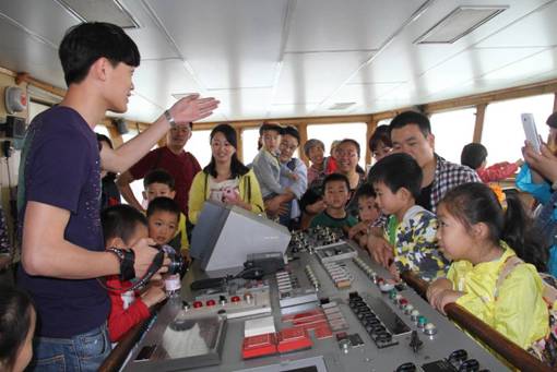 在“北斗号”调查船上,资源室朱建成作了内容丰富、形象生动的海洋科普知识讲座,结合黄海所的研究领域与科研进展,从不同海洋生物种类特性、资源分布、捕捞、声学探测评估、近海资源养护、海洋生态系统、南极科考、远洋与极地生物资源开发利用等方面,进行了深入浅出地讲解。财条处副处长张志强和“北斗”号船长李凤宾分别介绍了“北斗号”调查船的历史、承担的调查任务以及新科研调查船的筹建情况,并带领大家参观了驾驶室、船舱、甲板等主要工作区域,同时进行了现场讲解和示范。