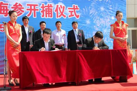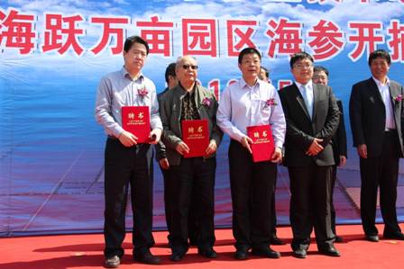 仪式上,金显仕副所长代表黄海所与东营海跃水产科技有限公司签订了长期科技合作框架协议。今后黄海所将在刺参良种选育、苗种扩繁、池塘改造、水质调控、高效养殖技术、附着基设置、饲料配制与投喂、疾病防控、精深加工等方面为东营地区海参高效产业化模式提供技术支撑。