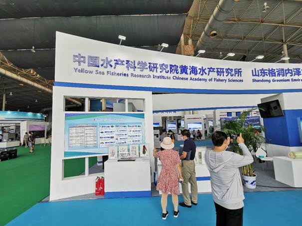 展会期间,黄海水产研究所展区内展示了海带“黄官1号”和中国对虾“黄海1号”等水产新品种以及现代渔业设施、海洋智能装备与增养殖模式等最新研究成果,展出了“蓝海101”号调查船模型以及鱼、虾、贝、藻等标本实物?;坪K芯克骨死醋缘胤秸⒖蒲性核退笠档拇罅坎位崛嗽鼻袄唇涣?,洽谈合作。