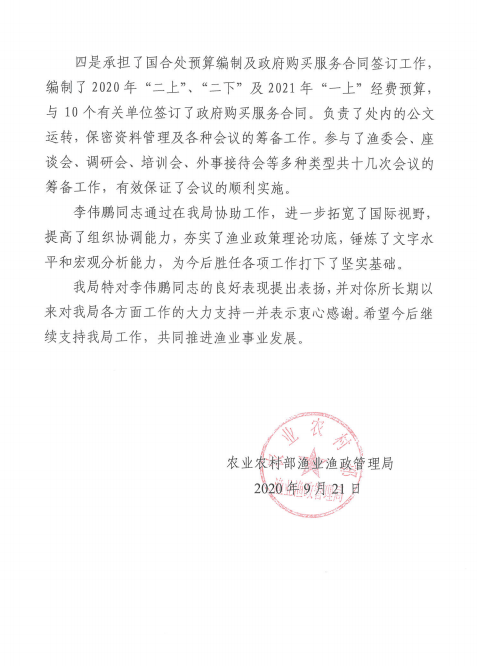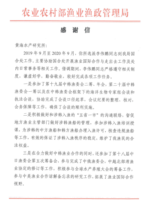 日前,中国水产科学研究院黄海水产研究所借调人员李伟鹏受到农业农村部渔业渔政管理局来信表扬。