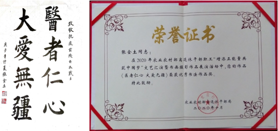 在2020年农业农村部离退休干部职工“增添正能量 共筑中国梦”文艺汇演暨书画摄影作品展演活动中,中国水产科学研究院黄海水产研究所退休干部张金土同志的书法作品《医者仁心 大爱无疆》荣获优秀书法作品奖。